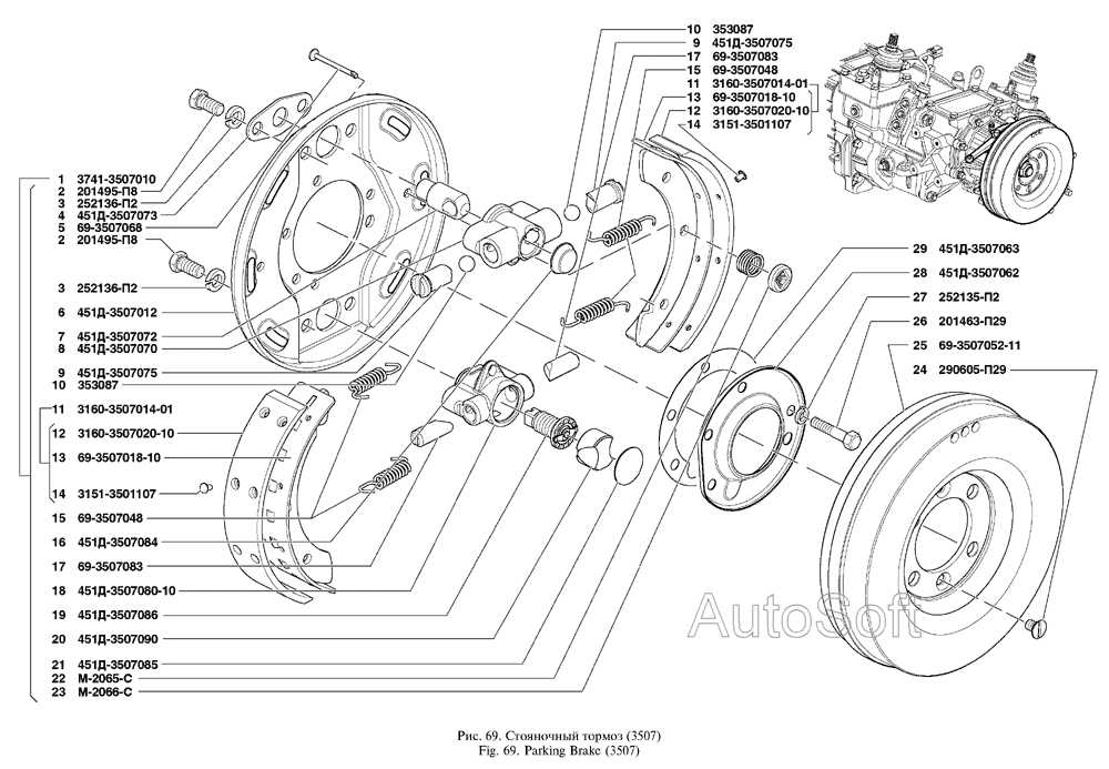 Стояночный тормоз UAZ Patriot (Чертеж 106: список деталей, стоимость запчастей). Каталог 2007г.